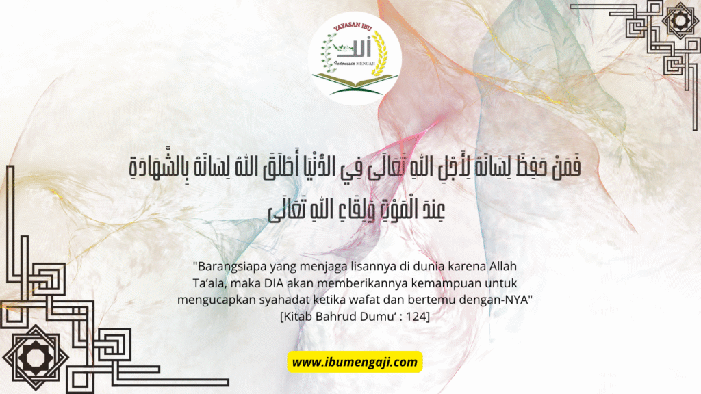 www.ibumengaji.com Kalimat hikmah yang menegaskan hubungan erat antara penjagaan lisan di dunia dengan kemuliaan akhir kehidupan seseorang. Para ulama menjelaskan bahwa lisan merupakan anggota tubuh yang paling kecil namun memiliki pengaruh terbesar terhadap nasib manusia, baik di dunia maupun di akhirat. فَمَنْ حَفِظَ لِسَانَهُ لِأَجْلِ اللهِ تَعَالَى فِي الدُّنْيَا أَطْلَقَ اللهُ لِسَانَهُ بِالشَّهَادَةِ عِندَ الْمَوْتِ […]