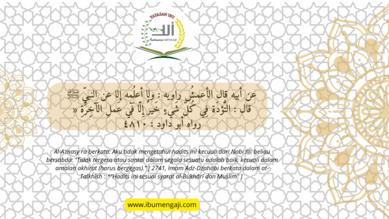 www.ibumengaji.com Dalam kehidupan modern yang serba cepat, tuntutan untuk selalu produktif dan efisien seringkali membuat kita terjebak dalam budaya ‘tergesa-gesa’. Di tengah arus deras ini, sebuah hadits yang diriwayatkan oleh Al-A’masy menawarkan perspektif seimbang yang sangat relevan. Rasulullah ﷺ bersabda: “Tidak tergesa atau santai dalam segala sesuatu adalah baik, kecuali dalam amalan akhirat (harus bergegas).” Hadits yang menurut penilaian Imam Adz-Dzahabi memenuhi syarat al-Bukhārī dan Muslim ini mengandung kebijaksanaan mendalam tentang manajemen waktu dan prioritas hidup.