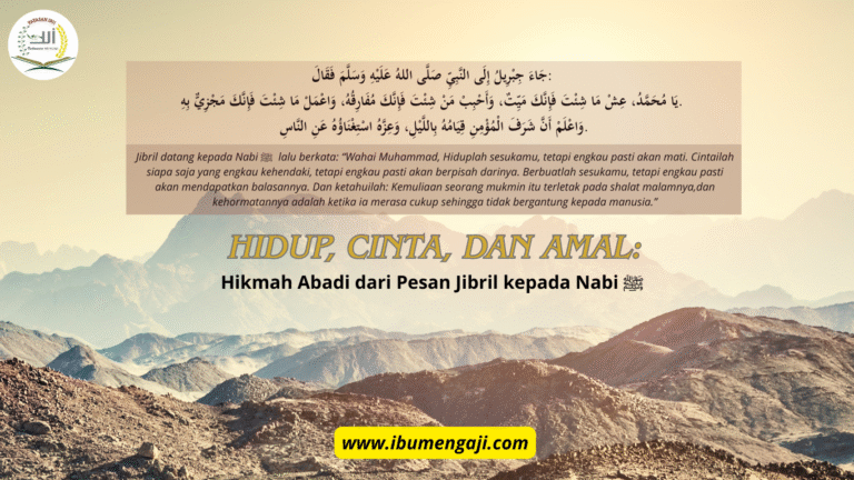 www.ibumengaji.com Salah satu hadits yang sarat makna tentang kehidupan adalah pesan Jibril kepada Nabi Muhammad ﷺ: “Hidup sesukamu, tetapi engkau pasti akan mati. Cintailah siapa pun yang engkau mau, tetapi engkau pasti akan berpisah darinya. Berbuatlah sesukamu, tetapi engkau pasti akan dibalas. Dan kemuliaan seorang mukmin adalah qiyamullailnya, serta kehormatannya adalah merasa cukup dari manusia.” Hadits ini memberi rangkuman padat tentang realitas hidup, arah cinta, tanggung jawab amal, serta sumber kemuliaan seorang hamba.